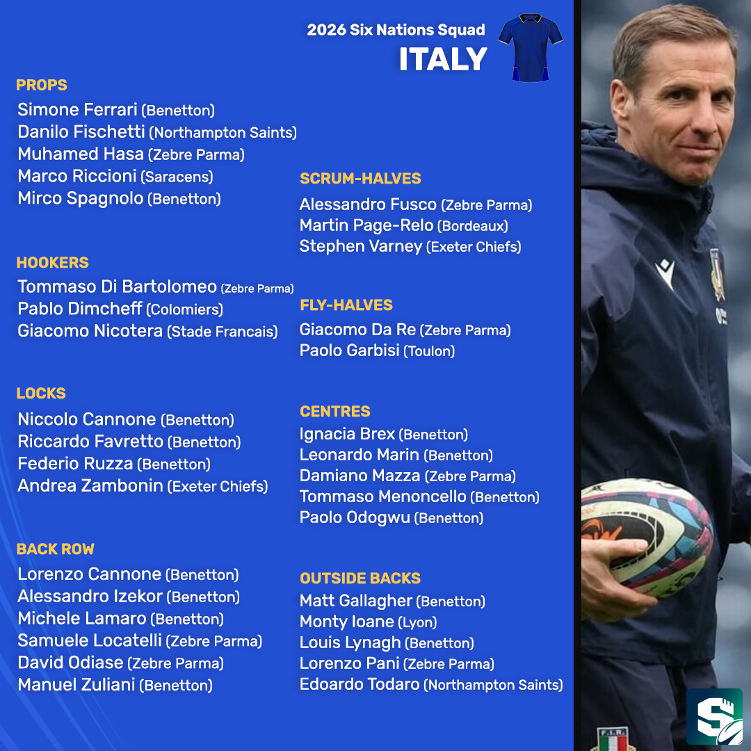 Gonzalo Queseda has named 33 players in his Azzurri squad for this year which will be captained by Michele Lamaro.Ange Capuozzo's absence through injury is a huge blow, but it will be interesting to see how Edoardo Todaro gets on after a stunning Gallagher PREM season so far where he has picked up a lot of fantasy points for Northampton Saints.