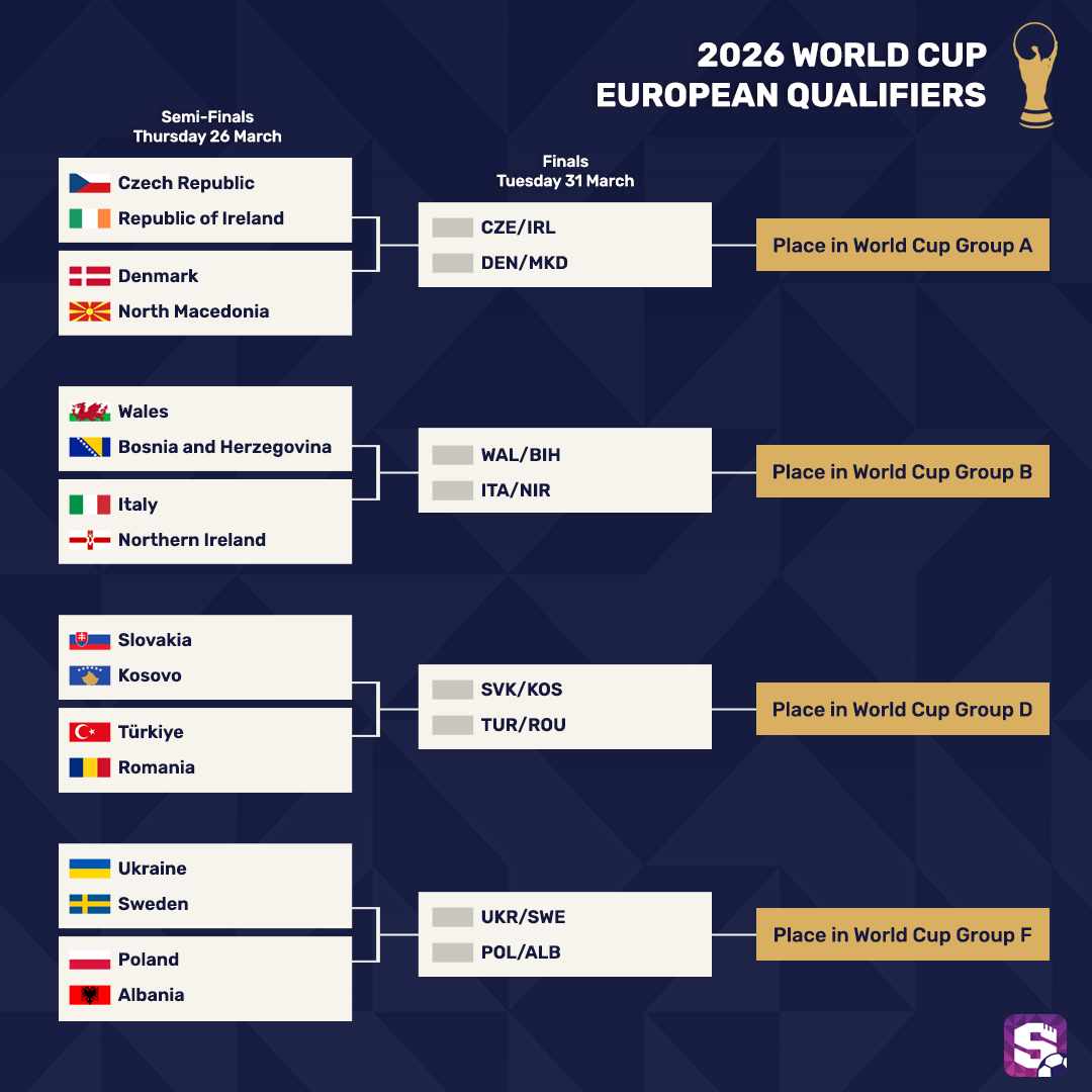 We've outlined the bracket for the European qualifiers on the graphic below. The semi-finals take place tomorrow (Thursday) with the finals next Tuesday, 31st March.
