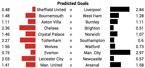 Using the average taken from the thousands of picks to have been made in our main game - the Premier League Predictor - we're able to provide you with a 'predicted goals' tally for each team in every round of the competition and we believe this can come in handy when choosing between certain players for your fantasy points.