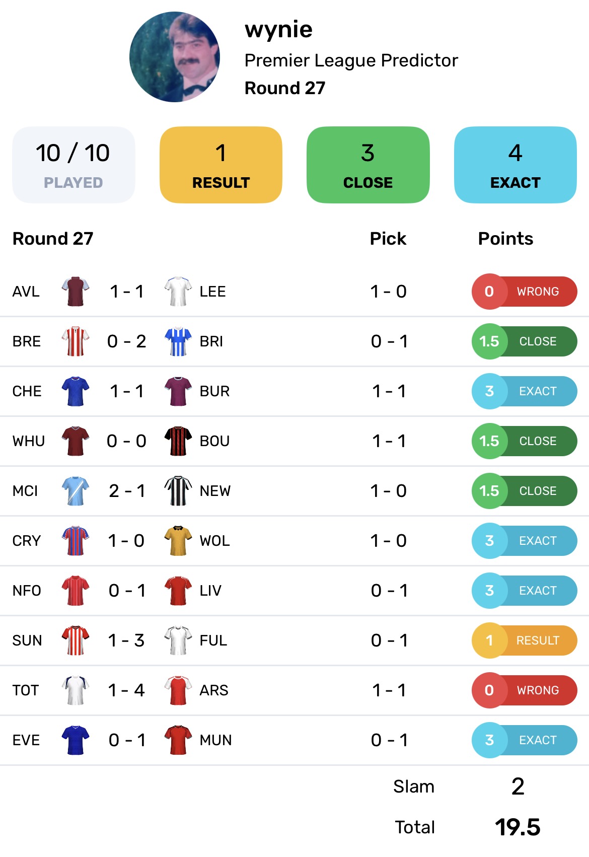 An exact for that final game between Everton and Man Utd took wynie up to 19.5pts in Round 27, half a point more than a couple of other players managed.Here are the picks that won wynie the Aussie key, including an excellent Exact for Chelsea 1-1 Burnley.