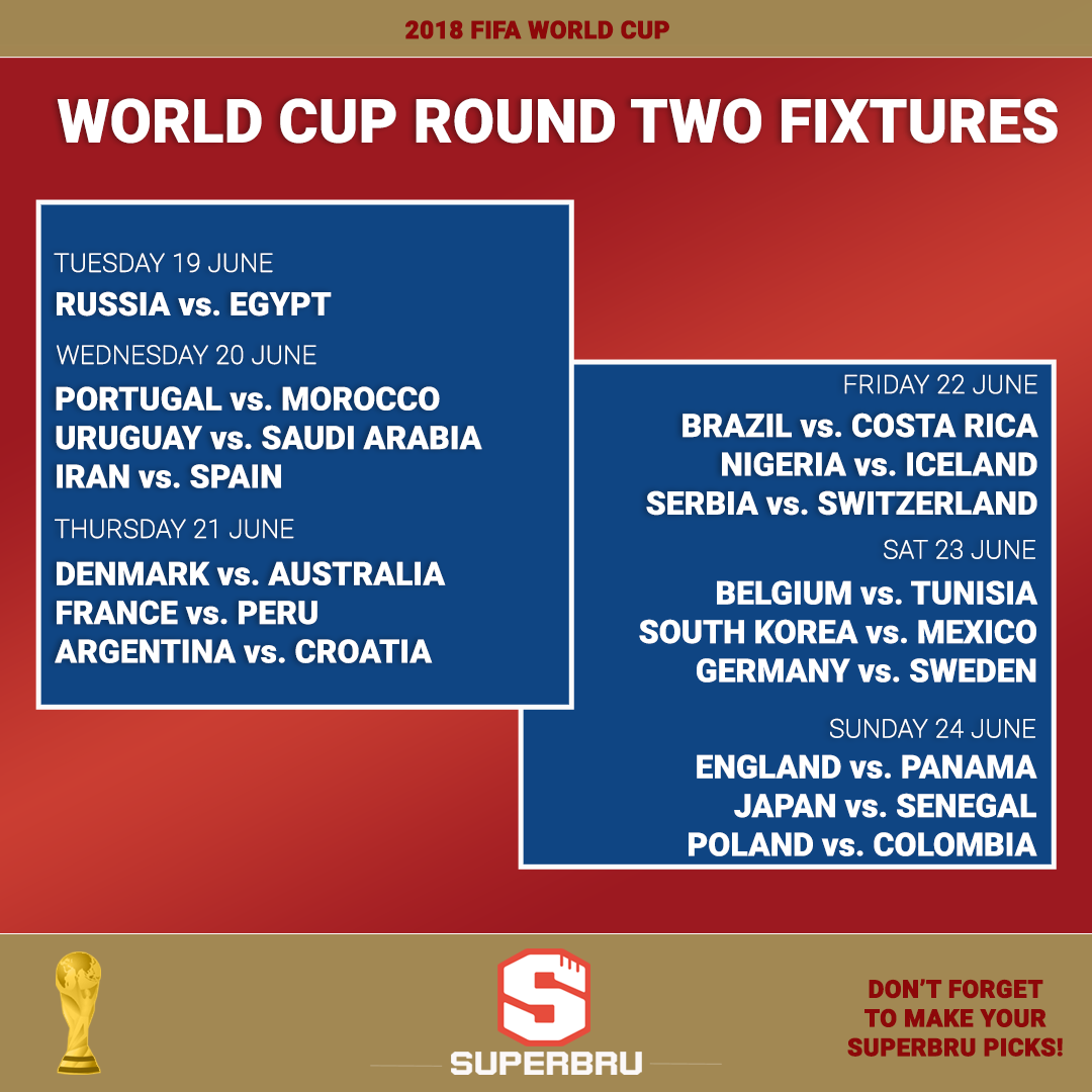 Here are the Round Two games we need to predict along with my picks below. The round begins at a slightly awkward time with Russia taking on Egypt tonight so make sure you make a pick for that one now!